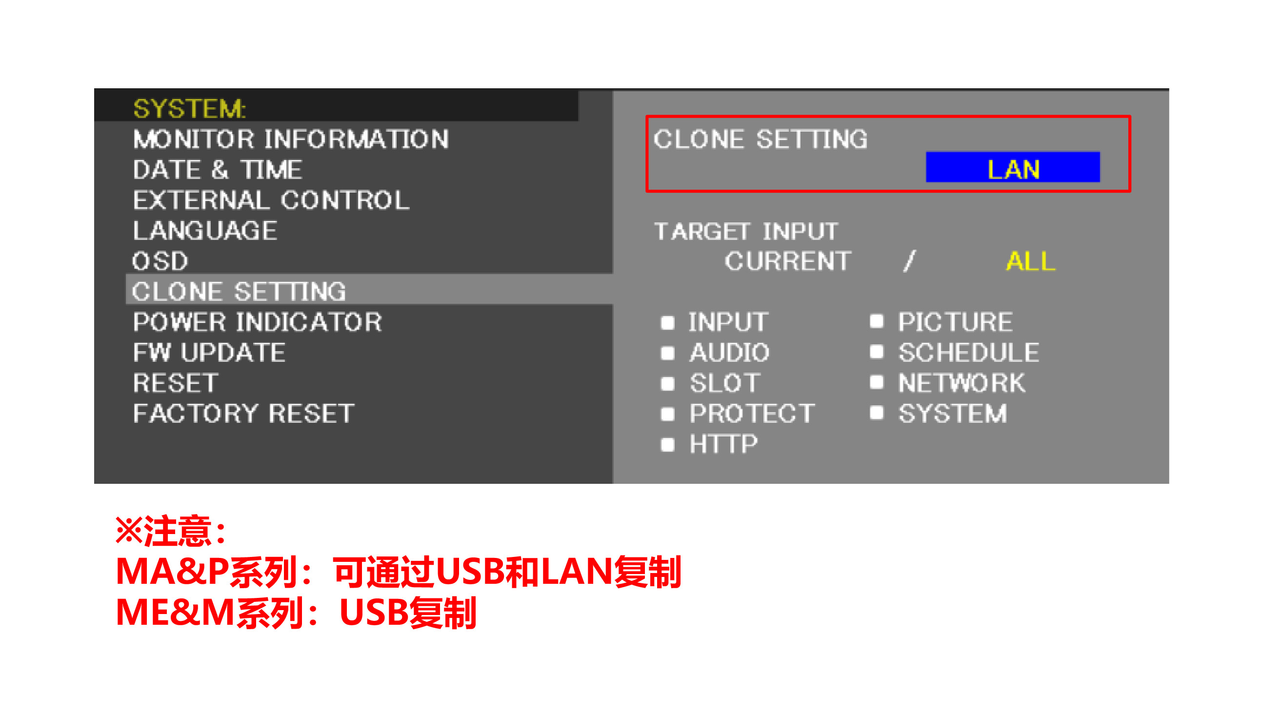 通過U盤或LAN,可將目標顯示器的參數復制到指定顯示器